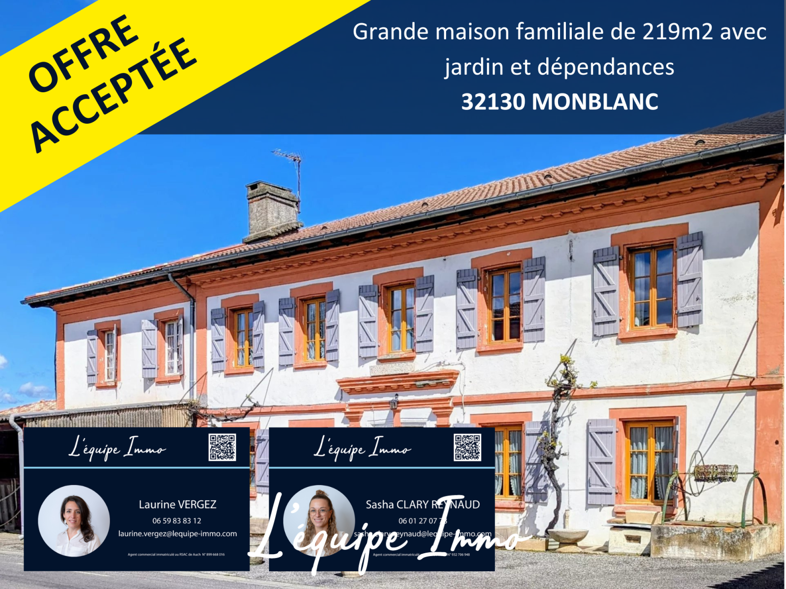 A 5km de Samatan, au c?ur de la commune de Monblanc, village avec écoles, venez découvrir cette grande maison familiale de 219m2 et ses 140m2 de dépendances offrant de nombreuses possibilités. Au rez-de-chaussée une entrée dessert les pièces de vie équipées chacune d'une cheminée. A l'étage vous trouverez 5 chambres de 12 à 20 m2 et pourrez profiter d'une belle vue sur les Pyrénées. L'ensemble des dépendances attenantes et communicantes (ancienne forge et porcherie) permettent d'accueillir de nombreux projets : garage, terrasse, atelier, local commercial ou encore plusieurs logements avec entrées indépendantes. Coté extérieur, à l'arrière et au calme, vous disposez d'un jardin d'environ 600m2 offrant vue sur la campagne gersoise. Au sud, un parvis goudronné permet de créer une petite cour. La toiture a été récemment refaite, des travaux de rénovation sont à prévoir.