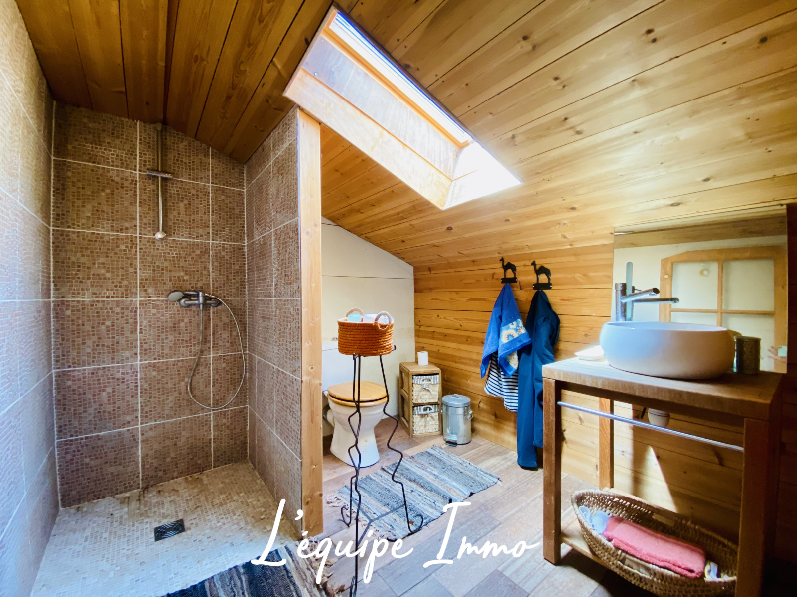 L'ancienne étable a été aménagé en pièce de vie proposant à la fois un espace de convivialité salon séjour avec cheminée et une cuisine baignée de lumière en ouverture sur la forêt. Attenant à la cuisine, un cellier buanderie de 30m2 ainsi qu'une belle terrasse couverte de 40m2 réhabilitée pour profiter pleinement des saisons