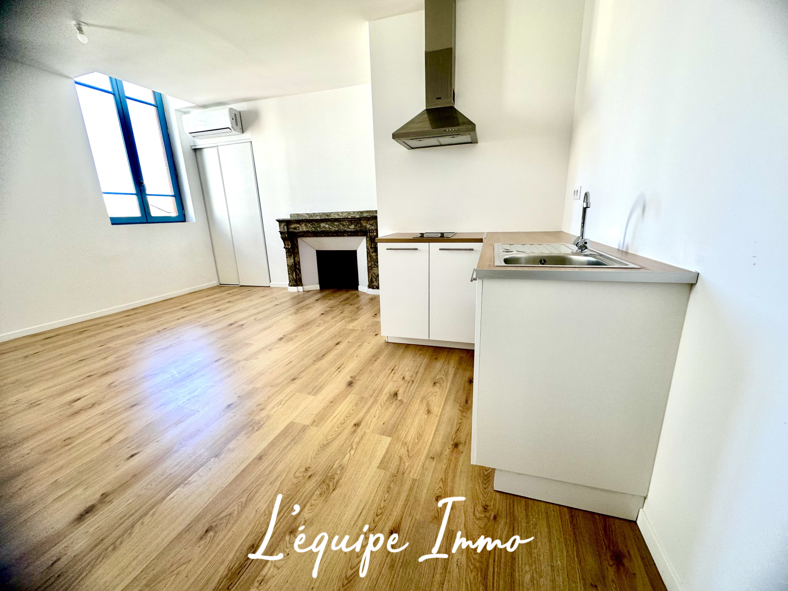 L'entrée offre une pièce à vivre lumineuse avec placard comprenant un espace cuisine avec une plaque deux feux et une hotte.