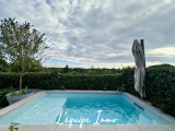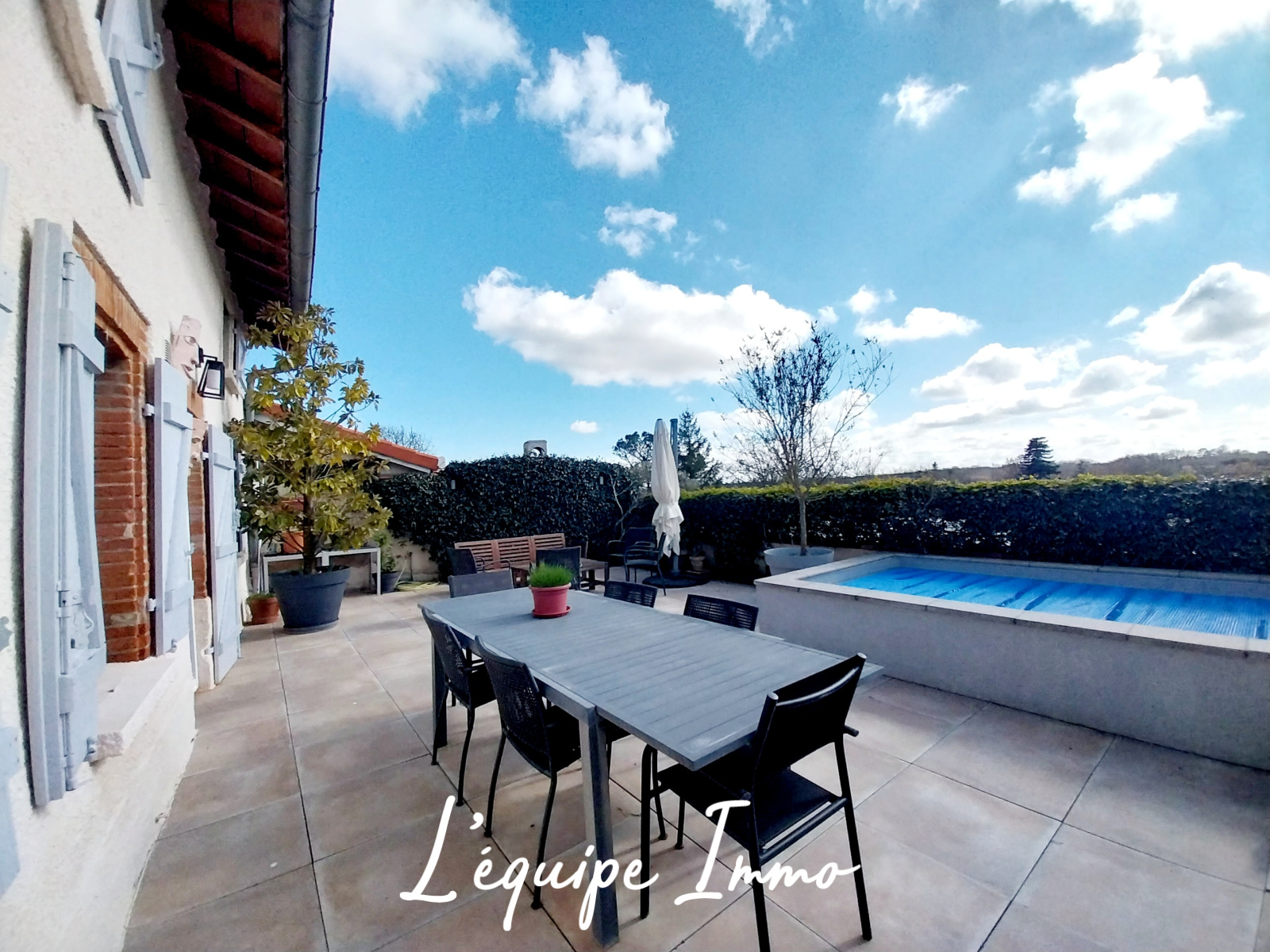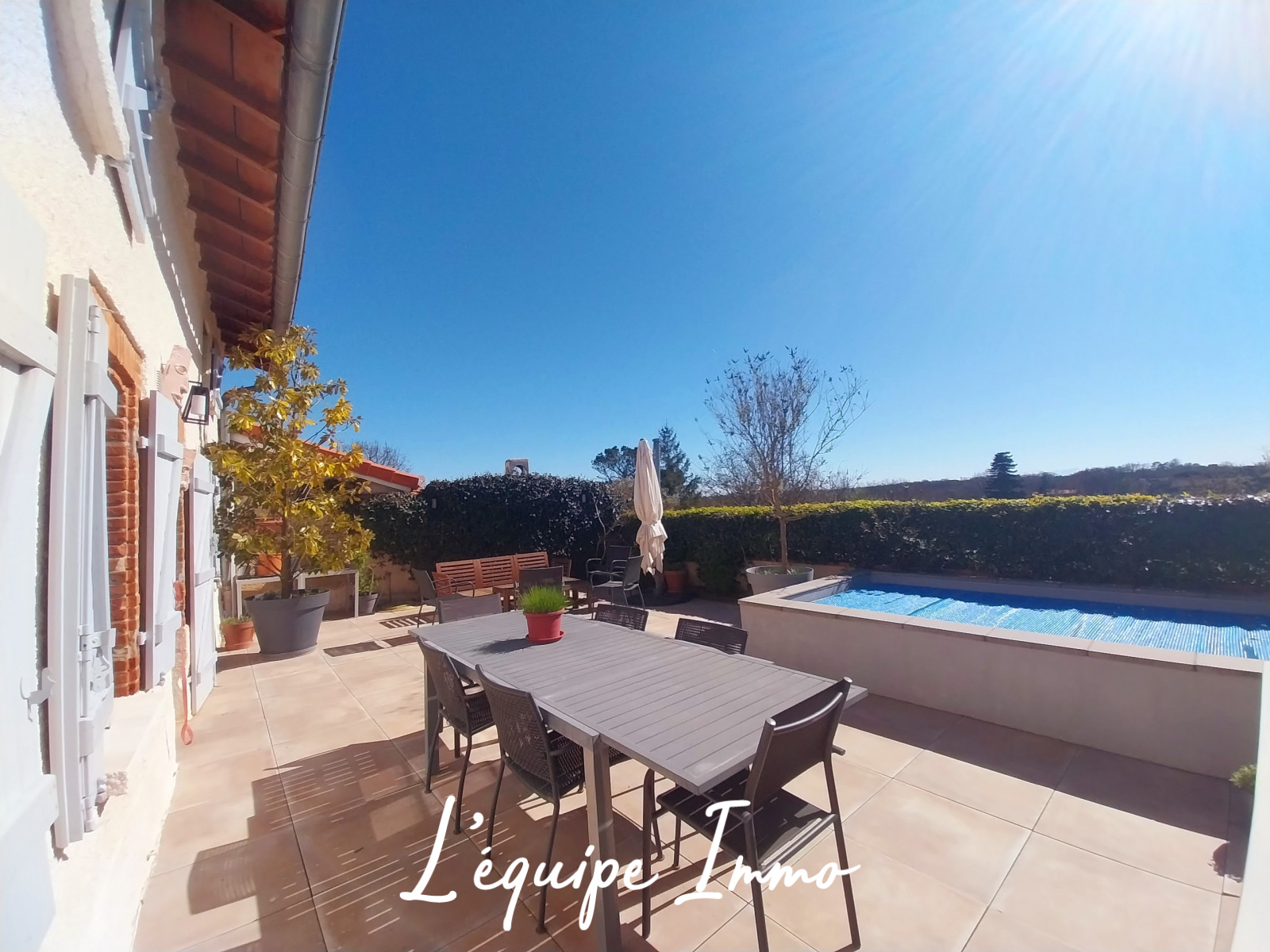 À l’extérieur, une agréable terrasse exposée plein sud prolonge les espaces de vie et invite à profiter pleinement des beaux jours. Une piscine vient compléter cet ensemble, offrant un véritable espace de détente et de convivialité