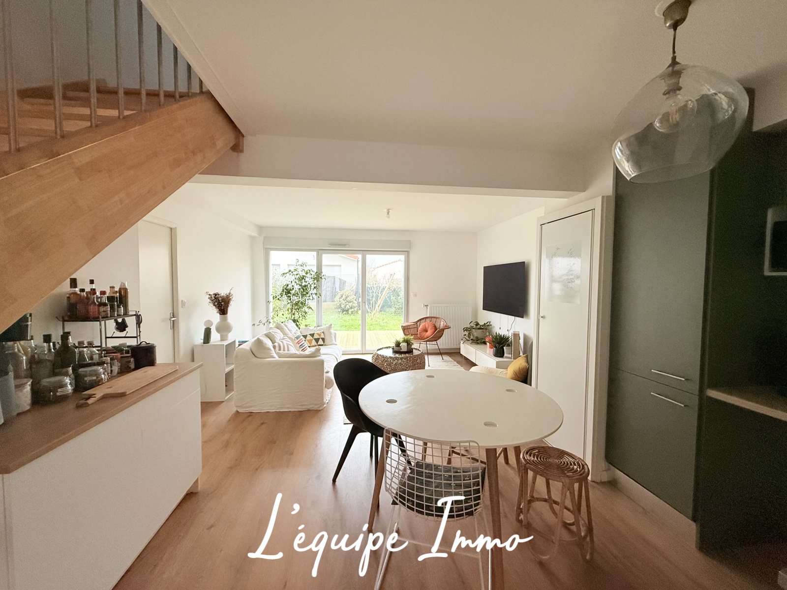 Elle dispose, au rez-de-chaussée, d'une belle pièce de vie lumineuse et chaleureuse avec son parquet en bois clair, une cuisine aménagée aux tonalités douces et naturelles, une grande chambre de plus de 13 m², et une salle d'eau avec douche, vasque et Wc.