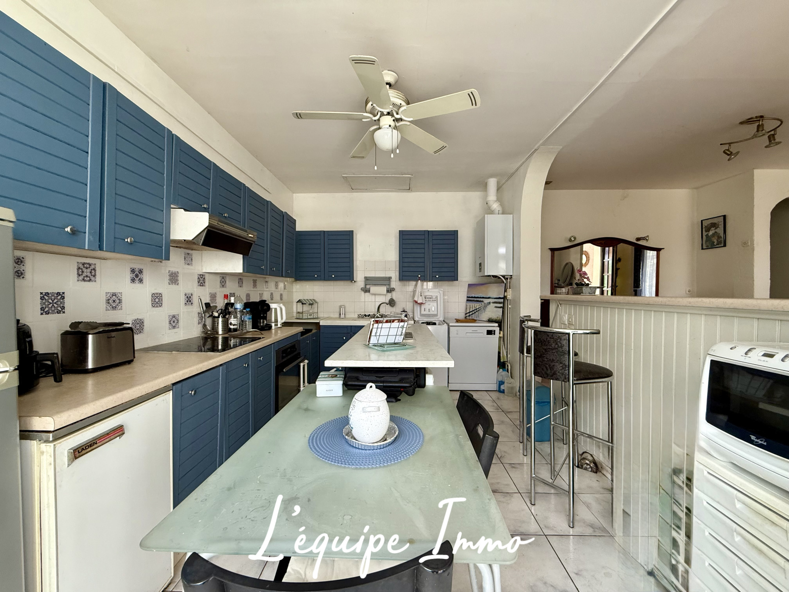 L'entrée se fait par une grande verranda coté jardin. A l'intérieur de la maison, une lumineuse pièce de vie avec salon et salle à manger donne accés à la cuisine semi-ouverte.
