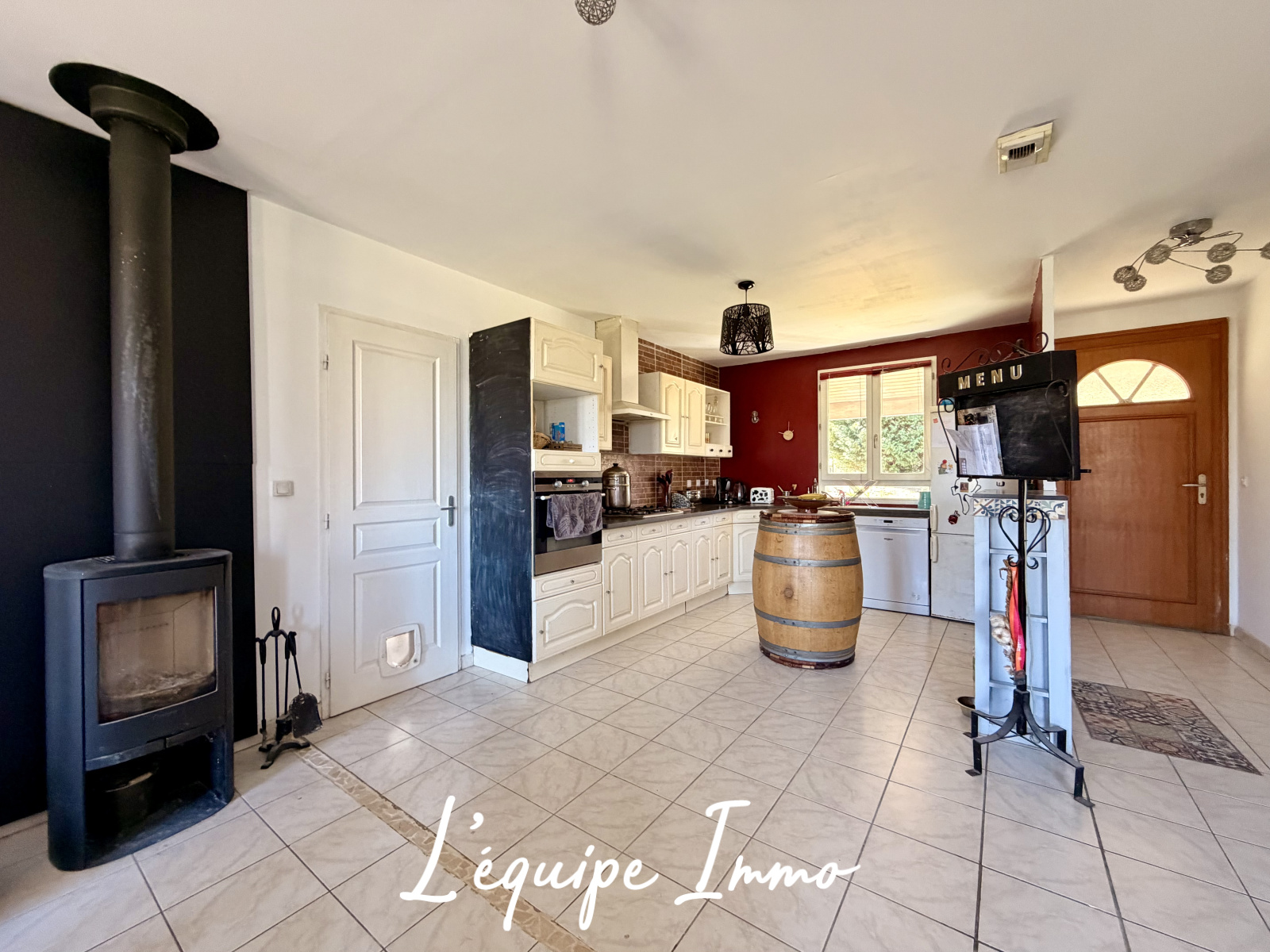 Le coin jour se compose d'une cuisine ouverte et d'une lumineuse pièce de vie avec poêle à bois et accès à la terrasse depuis laquelle la vue sur les champs est imprenable.