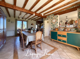 A gauche, la cuisine ouverte sur la lumineuse salle à manger donnant accés aux terrasses dont une plein sud avec vue sur les pyrénées, et le salon avec insert idéal pour un moment de détente au coin du feu.