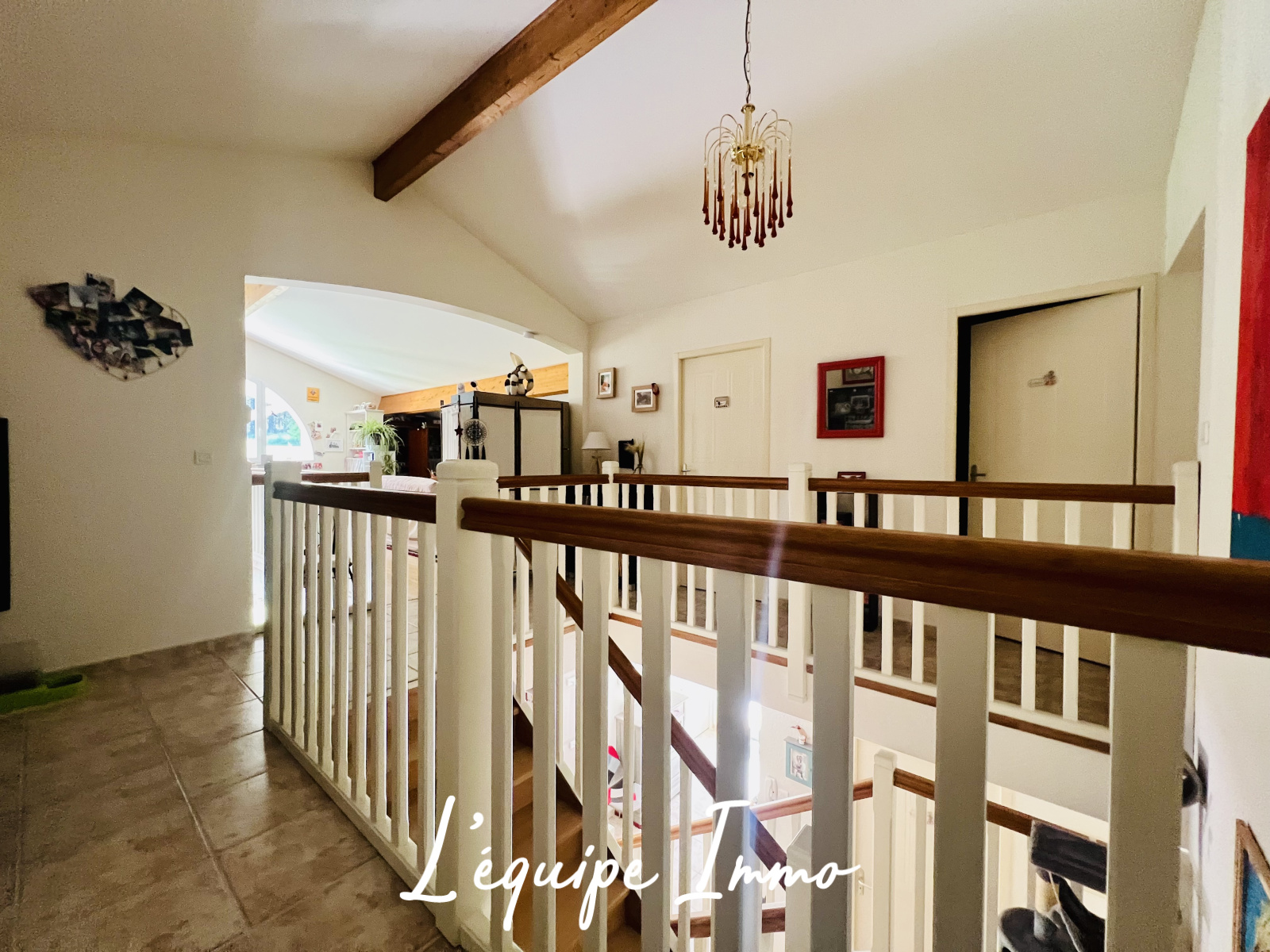Un grand hall d'entrée dessert une pièce de vie déplafonnée avec cuisine équipée et arrière cuisine donnant sur l'agréable terrasse couverte.